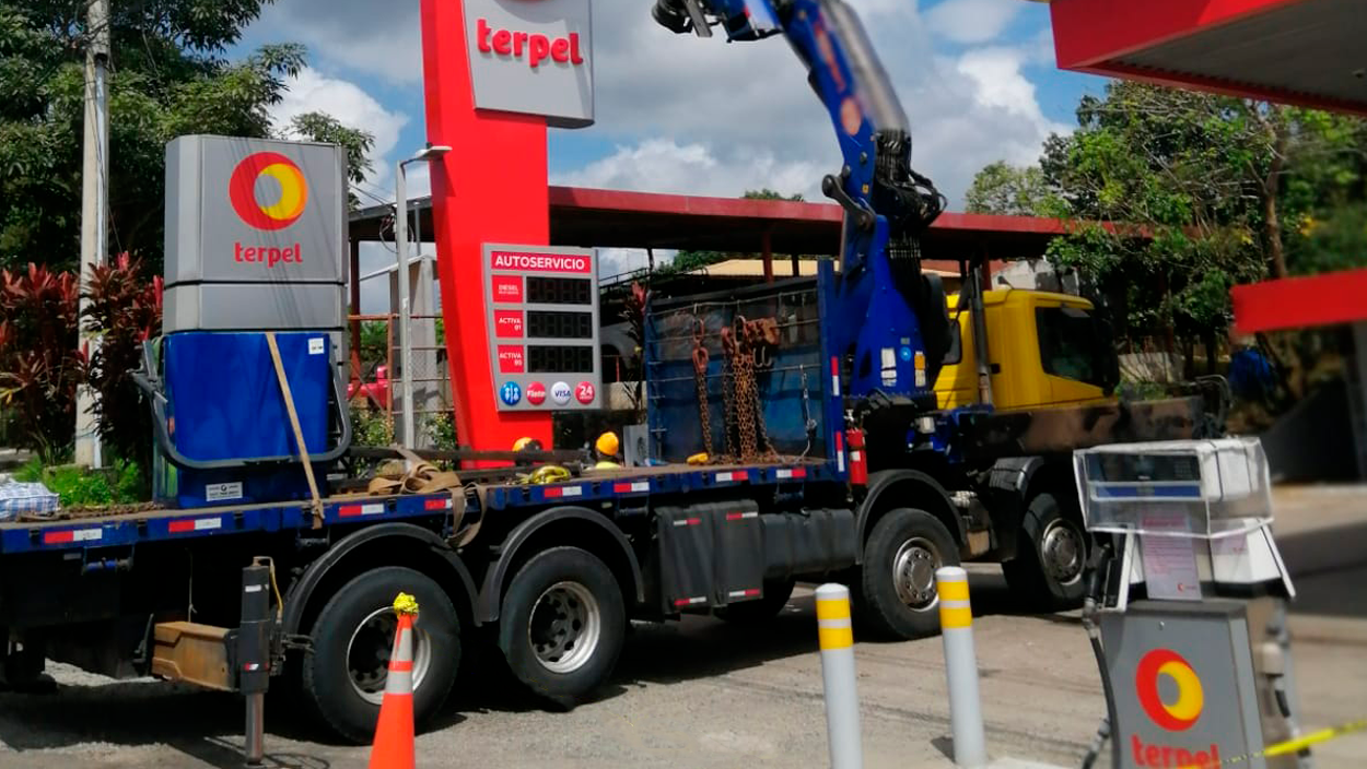 Grúas Orión has been working on this project, putting all of the new towers, advertising, new logo and structures of this new image that Gasolineras Terpel is showing off in place.